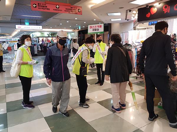 대구시는 코로나19 극복을 위한 ‘생활 속 거리두기’ 캠페인을 지난 8일에 이어 15일도 민간단체와 함께 실시했다. 이번 캠페인에서는 7대 기본생활수칙 중 ‘마스크 착용 생활화’를 중점 홍보했다.