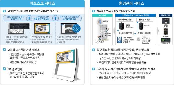 ①다양한 환경센서를 통해 실내미세먼지, 온습도, 유해가스누출, 흡연여부 등 환경상태를 확인할 수 있는 환경관리 서비스, ②민원인의 시설물 이용편익 증진을 위해 3차원 기반 건물 내 동선을 안내할 수 있는 키오스크 서비스, ③vr기술을 활용한 가상의 재난대응 교육 및 외국어 체험 서비스, ④시설물 운영관리에 첨단 ar서비스를 적용한 비대면 스마트한 정비환경 제공, ⑤드론의 빠른 기동성을 바탕으로 통합적인 보안/재난/안전관제서비스 제공, ⑥열화상카메라를 장착한 무인로봇을 활용한 전염병 예방 및 보안사각지대 점검, ⑦시설물의 전력사용량 분석을 통해 최적의 에너지 운용방안을 구축할 수 있는 서비스를 제공한다.