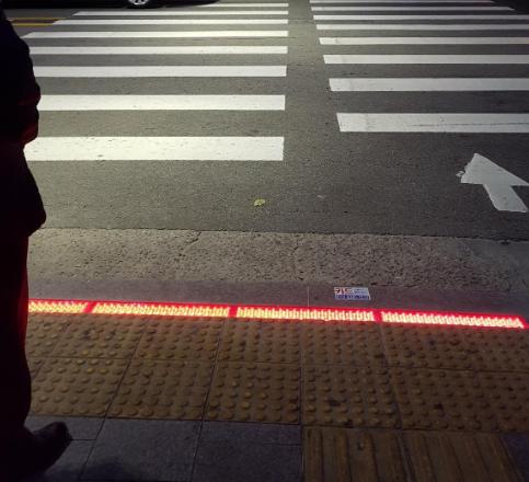 ‘바닥신호등’은 횡단보도에 기존 신호등과 동일한 신호를 바닥에 있는 연석과 시각장애인용 유도블럭 사이에 설치된 LED 패널을 통해 동시 표출하는 보조 신호등이다. 신호등이 녹색불로 바뀌면 동시에 LED패널도 녹색불로 바뀌어 주민들이 보다 편리하게 신호를 확인할 수 있다.