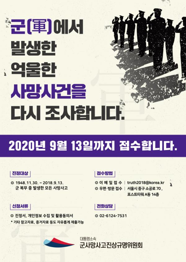 ?대통령소속 군사망사고진상규명위원회?는 특별법에 따라 2018년 9월 설립되었으며, 3년의 활동기간 동안 군대에서 발생한 사망사고에 대해 유가족이나 목격자 등의 진정을 받아 공정하고 객관적인 조사로 진실을 규명하는 업무를 수행한다.