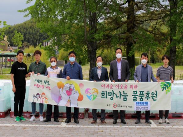 '(사)희망을나누는사람들'과 금속가공유 전문기업 범우연합은 최근 코로나19 예방을 위한 살균소독제 576통(5천만 원 상당)을 담양군복지재단으로 전달했다.