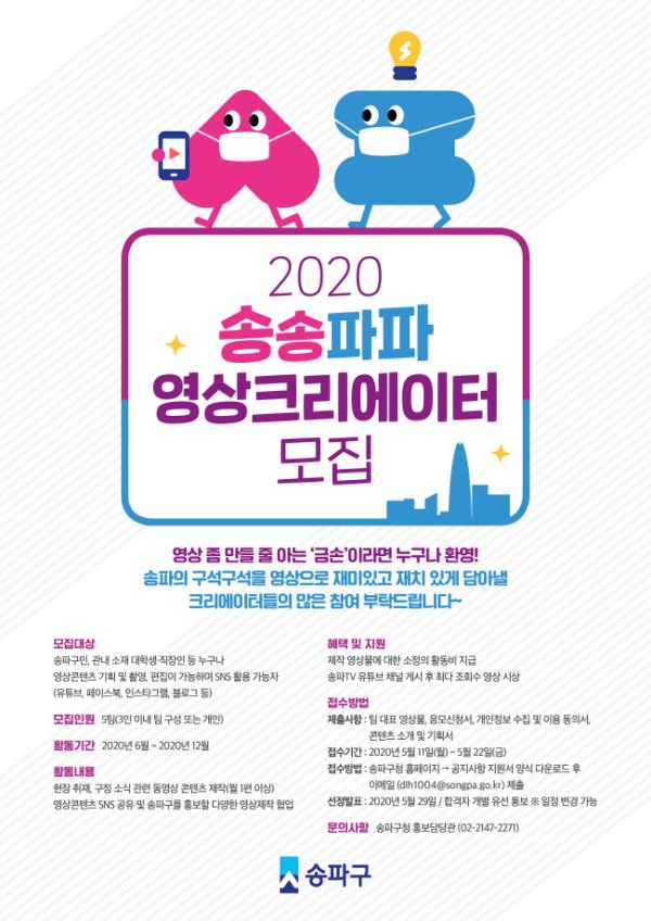 송파구(구청장 박성수)가 구정 곳곳의 모습을 창의적인 영상으로 담아낼 ‘송송파파 크리에이터’를 오는 22일까지 모집한다.