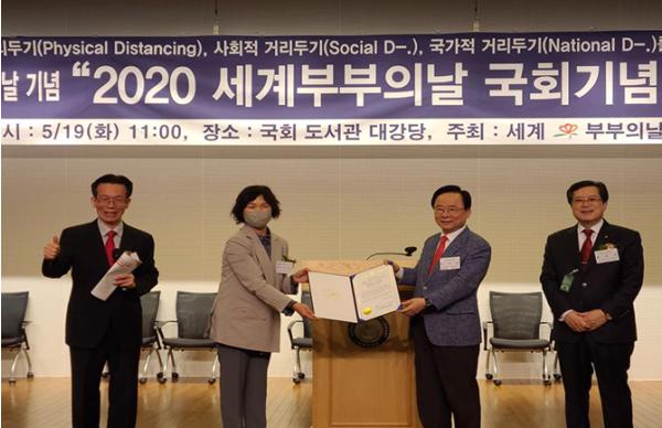 세계 부부의 날 위원회와 국회 부의장 이주영 의원실에서 공동 주최하는 ‘2020 세계 부부의 날 국가 기념행사’에서 대구시민 일동과 대구시 의료진(대구시의사회, 대구시간호사회)이 ‘2020 올해의 특별 가족상’을 수상했다.