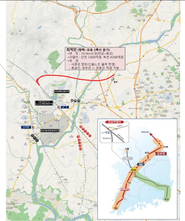 최적안으로 선정된 평택~오송 2복선 신설노선 분기방안은 오송역 북쪽 7km 지점 경부고속선 지하터널에서 분기하여 청주역까지 13.1km를 연결하는 것으로 단선은 3,000억원, 복선은 4,000억원의 사업비가 소요된다.
