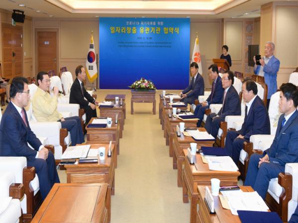 광주시는 19일 시청 비즈니스룸에서 (사)하남산업단지관리공단, (사)평동지역기업운영협의회, (사)첨단산업단지경영자협의회, 광주소상공인연합회, (사)한국외식업중앙회 광주시지회, (사)광주광역시상인연합회, (재)광주경제고용진흥원 등 7개 일자리창출 유관단체와 ‘코로나19 위기 극복을 위한 일자리창출 협력’ 업무협약을 체결했다.