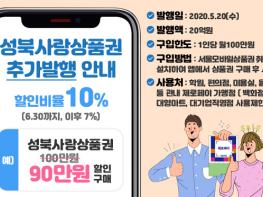 성북구(구청장 이승로)가 골목상권 소비와 소상공인 매출확대를 위해 발행하는 모바일 '성북사랑상품권'을 10% 할인된 금액으로 추가 판매한다고 19일 밝혔다. 총 20억원 규모로 20일부터 성북사랑상품권 결제 어플을 통해서 판매를 시작한다.
