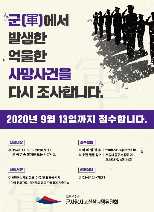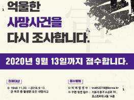군 관계자는 “위원회 활동 기간이 한시적이고 특별법상 직권조사는 허용되지 않기 때문에 관내 유족들이 시일을 놓쳐 신청을 하지 못하는 사례가 없도록 홍보 활동에 적극 협조하겠다”고 밝혔다.