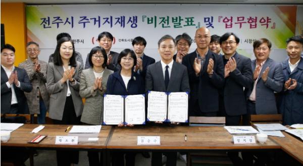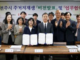 협약에 이어 양 기관은 ‘시민과 함께, 살고 싶은 전주 집다움’이라는 주거지재생 비전과 △노후 밀집주거지 밀도 관리 △주민이 경제적으로 부담 가능한 노후주택 정비 △골목상권과 돌봄서비스가 공존하는 골목 공동체 조성 △노후주택 에너지 성능 개선 △보행이 쉽고 이동이 편리한 주거지 조성 △문화예술 활동 연계 △한옥·미래유산 활용 등 7대 추진과제를 발표하기도 했다.