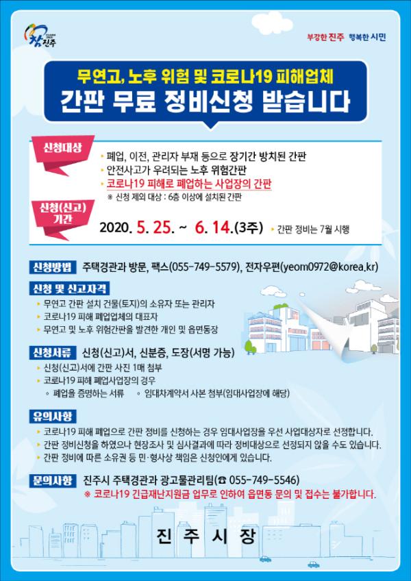 진주시는 오는 25일부터 무연고·노후위험·코로나19피해 간판을 정비하기 위해 사업신청 및 신고를 접수한다고 밝혔다.