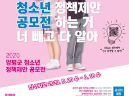 양평군(군수 정동균)은 2020년 5월 20일부터 6월 10일까지 청소년들의 다양하고 참신한 목소리를 담은 아이디어 및 정책제안을 군정에 반영하기 위해 “청소년 참여의 시작! 청소년이 바라는 양평군!”이라는 주제로 2020년 청소년 정책제안 공모전을 개최한다.