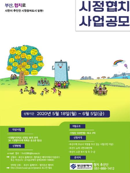 부산시 관계자는 “이번 사업공모를 통해 시민이 주도하고, 민과 관이 협력해 사업계획을 수립하고 실행하는 시정참여도시 부산의 새로운 길이 열렸다.”라며 “민-관 협치 활동을 함께하실 시민 여러분의 많은 참여를 부탁드린다”라고 말했다.