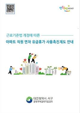 대전 서구(구청장 장종태)는 ‘아파트 직원 연차 유급휴가 사용촉진제도 안내서’를 관내 공동주택 관리주체와 입주자대표회의에 배포한다고 20일 밝혔다.