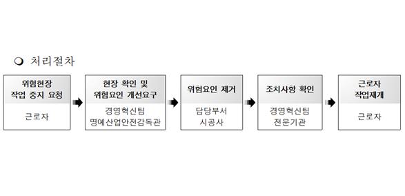 작업중지요청제는 현장 근로자가 위험 상황을 인지하였을 때 공단에 직접 일시 작업 중지를 요청하고 후속 조치를 통해 안전을 확보한 후 작업을 재개함으로써 사고를 미연에 방지할 수 있는 제도이다.