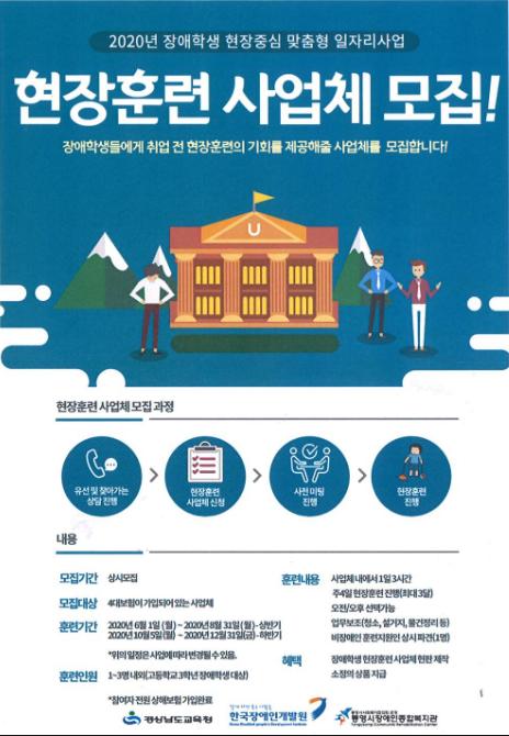 통영시장애인종합복지관(관장 정병두)은 한국장애인개발원과 경상남도교육청에서 공모한 “2020년 장애학생 현장 중심 맞춤형 일자리사업”수행기관으로 선정되어 장애학생들에게 취업 전 현장훈련의 기회를 제공해줄 사업체를 상시 모집한다.