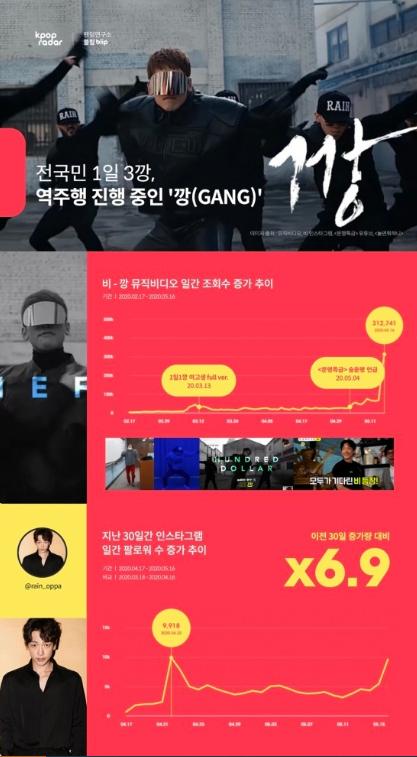 케이팝 레이더 측은 “지난 일주일간 가수 비에게 발생한 총 216만 건의 조회수 중 94%에 해당하는 203만 건이 국내에서 발생했다”며 “이는 실제로 '1일 3깡'을 실천하고 있는 사람들이 많아진 것으로 추측해 볼 수 있다”라고 분석했다.