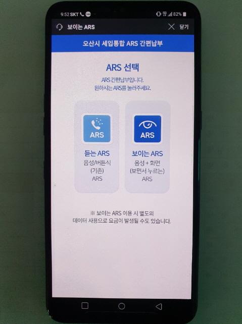 스마트폰을 이용해 ‘오산시 세금 납부 자동응답시스템(☎1588-6074)’으로 전화하면 음성과 함께 ‘보이는 ARS 세금 납부서비스’ 화면이 자동 실행된다.