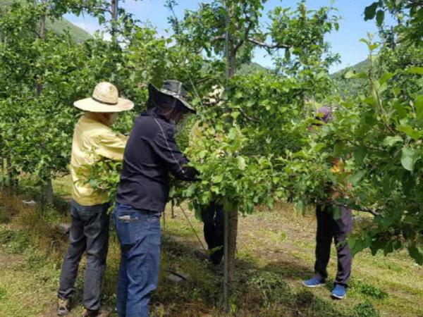 김천시 맑은물사업소(소장 김종철)에서는 20일 본격적인 영농철을 맞아 코로나19로 인해 일손이 부족한 대덕면 덕산리 사과농장을 방문하여 사과적과 농촌일손돕기를 전개했다.