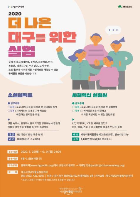 대구시 시민공익활동지원센터는 5월 25일부터 6월 14일까지 ‘소셜임팩트’와 ‘사회혁신실험실’ 2차 공모를 진행한다.