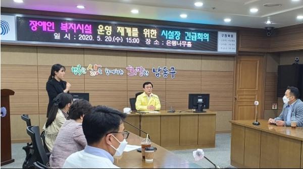 남동구는 지난 20일 '코로나19'로 휴관 중인 남동장애인종합복지관 등 18개 장애인복지시설 시설장과 운영 재개를 위한 긴급회의를 가졌다고 22일 밝혔다.
