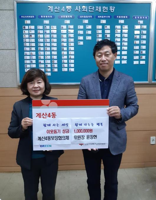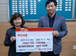 인천 계양구 계산4동에서는 지난 20일 계산4동 보장협의체를 이끌고 있는 윤장현 위원장이 코로나19로 어려움을 겪고 있을 저소득층 가구를 위해 사용해줄 것을 바란다며 이웃돕기성금 100만 원을 기탁하였다고 전했다.