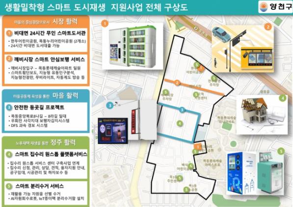 양천구는 목3동 도시재생 뉴딜지역을 대상으로 5개 스마트기술 지원 사업을 응 모했으며, 최종 선정된 다섯 가지 사업은 ▲ 깨비시장 스마트 안심보행 서비스 ▲ 비대면 24시간 무인스마트 도서관 ▲ 안전한 등굣길 프로젝트 ▲ 스마트 집수리 원 스톱 플랫폼 구축 ▲ 스마트 분리수거 서비스 이다.