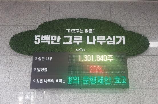 마포구(구청장 유동균)가 구 역점사업의 하나인 500만 그루 나무심기 사업의 정보를 공유하고 주민들의 지속적인 관심을 유도하기 위해 구청사 1층에 사업 현황판을 설치해 공유한다고 밝혔다.