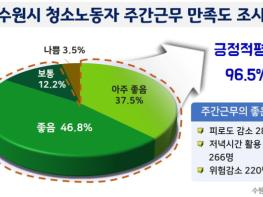 수원시가 지난 4월 1~3일 13개 청소대행업체 근로자 515명을 대상으로 만족도 조사를 진행한 결과, ‘아주 좋음’ 193명, ‘좋음’ 241명, ‘보통’ 63명 등 96.5%가 긍정적인 평가를 했다.