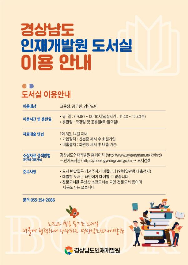 인재개발원은 그동안 교육생과 공무원이 주로 이용하던 도서실을 지역주민이 보다 쉽게 이용할 수 있도록 온라인 회원가입, 전자도서 구입 확대, 지역민 의견을 반영한 도서 구입 등을 실시한다.
