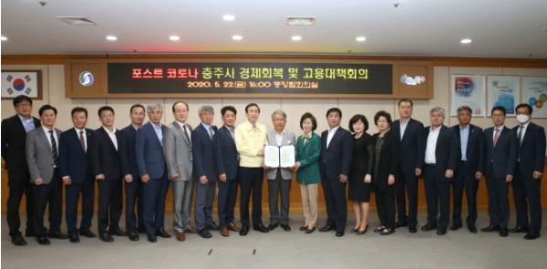 충주시는 지난 22일 충주시청 3층 중앙탑회의실에서 지역기관 단체장, 소상공인?기업단체 대표, 민간단체장 등 지역 대표 22명이 모인 가운데 포스크코로나 경제 회복 대책 회의를 개최했다.
