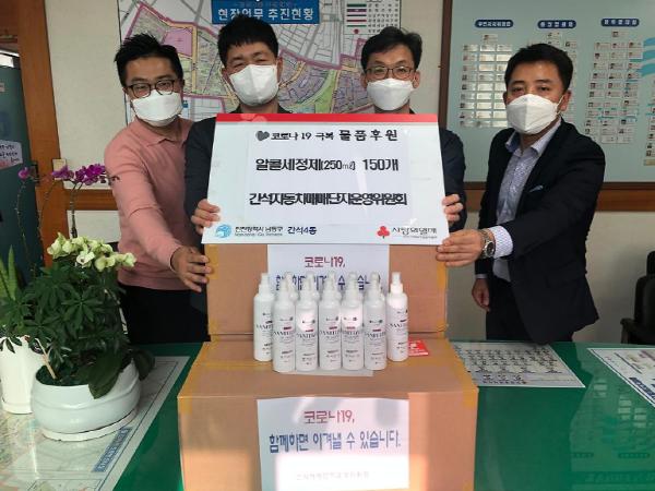 인천시 남동구 간석4동(동장 김정훈) 행정복지센터는 지역 내 자동차매매단지 운영위원회(위원장 장현창)로부터 코로나19 예방을 위한 소독세정제(250㎖) 150개를 후원 받았다고 밝혔다.