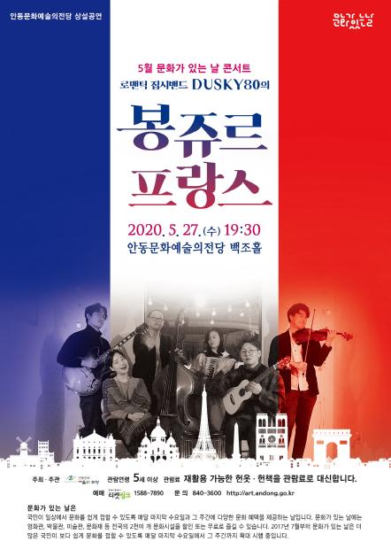 5월 문화가 있는 날 콘서트는 그윽한 아름다움이 묻어나는 프랑스 파리의 길거리 속에 있는 듯한 감성을 느낄 수 있는‘로맨틱 집시 밴드 DUSKY80의 봉쥬르 프랑스’ 공연으로 오는 27일 저녁 7시 30분 안동문화예술의전당 유튜브와 페이스북을 통해 생방송으로 만날 수 있다.