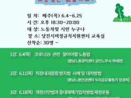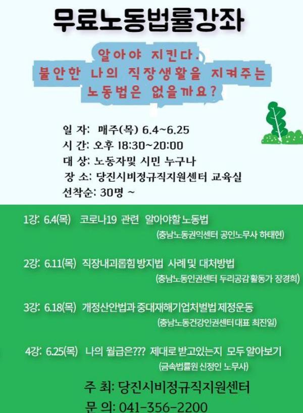 당진시 비정규직 지원센터(센터장 정상만)는 오는 6월 한 달간 매주 목요일 4회에 걸쳐 무료 노동법률 강좌를 진행한다.