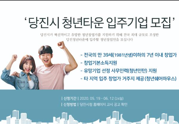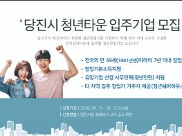 당진시가 청년타운 조성에 따라 전국의 만 39세 이하의 청년창업가를 대상으로 청년타운 입주기업을 모집하고 창업기본소득과 거주지 제공 등 청년 창업기업 육성에 적극 나선다.