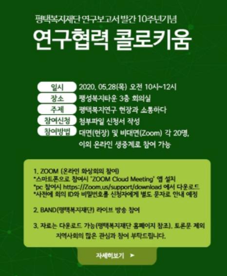 연구협력 콜로키움 참석자는 대면(현장참석) 20명, 비대면(온라인) 20명으로 구성할 계획이다. 평택복지재단 밴드에 콜로키움 행사 관련 “실시간 생중계(live)”를 진행할 예정인데 관심있는 시민은 누구나 밴드에 접속해 참여할 수 있다. 온라인 토론참여자는 ZOOM에 토론실을 개설해 참여할 수 있도록 하였다. 행사당일 연구보고서 발간 10주년 자료집과 기념품을 배포할 예정이다.