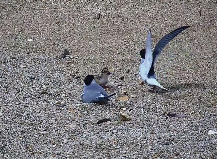 안동시가 조성한 안동호 쇠제비갈매기 인공 모래섬에서 5월 22일 첫아기 쇠제비갈매기가 어미에게 먹이를 달라고 조잘대기 시작했다.