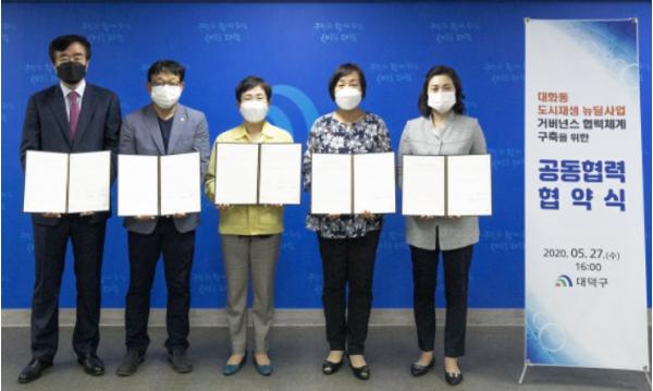 대전 대덕구(구청장 박정현)기 지난 27일 구청에서 대화동 도시재생 뉴딜사업 주민협의체(위원장 황선업), 대전산업단지관리공단(이사장 김종민), 대전원명학교(학교장 고은주), 한국산업제조유통협회(협회장 이보선)와 각각 대화동 도시재생 뉴딜사업 거버넌스 협력체계 구축을 위한 공동협력 협약을 체결했다.