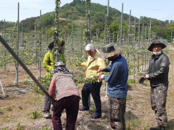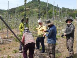 이외에도 22일까지 전북도청 대외협력국과 총무과 전라북도공무원노동조합, 무주군다문화가정센터, 한국도로교통공사 무주지사, 농협, 전북은행 등 기관 인원 100여 명이 사과 및 복숭아 등 과수 농가에서 열매솎기와 잡초제거 등 농가 일손을 거들었다.