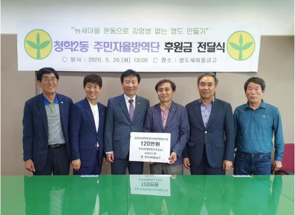 영도구 청학2동주민자치위원회(위원장 김종갑)와 영도새마을금고(이사장 박태민)는 지난 5월 26일 청학2동주민자율방역단(단장 윤승하)에 2020년 방역활동 격려하며 후원금 120만원을 전달하였다.