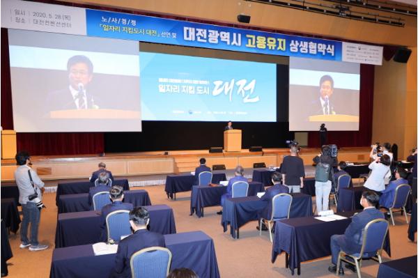 고용 등 실물경제의 위축이 본격화됨에 따라 대전시는 일자리를 지키겠다는 확고한 의지를 담아, 6개월간 고용유지 협약 기업에 재정을 지원하고, 기업과 경제단체가 고용유지를 약속하고 담보하는 사회적 협약인 ‘대전광역시 고용유지 상생협약’을 체결했다.