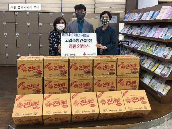 고려소방건설 정동환 대표는 코로나19 재난지원금 전액으로 라면20박스를 구입해 간석1동행정복지센터에 어려운 이웃을 위해 써달라며 전달했다