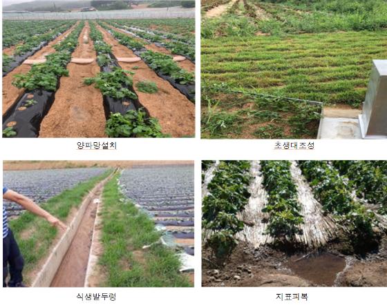 흙탕물 저감형 농법에는 양파망 설치, 초생대 및 식생밭두렁 조성 등이 있다.