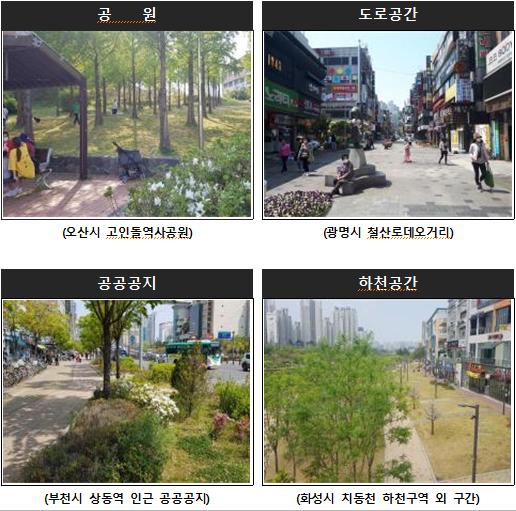 유형별로는 오산시 고인돌역사공원 등 공원공간에 21개 사업, 광명시 철산로데오거리 등 도로공간에 15개 사업, 부천시 상동역 인근 등 공공공지에 12개 사업, 화성시 치동천 일원 등 하천공간에 7개 사업이 다양하게 포함됐다.