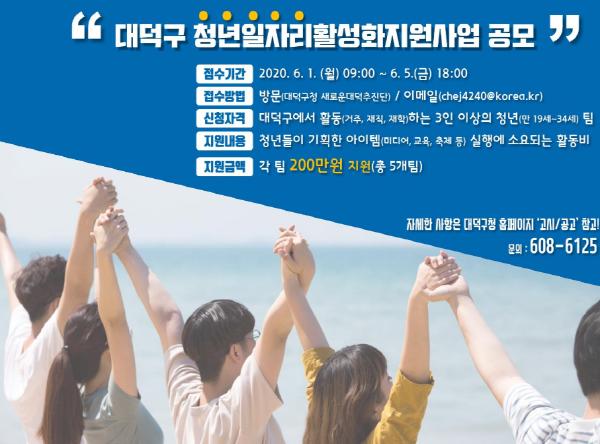 신청 자격은 대덕구에서 활동(거주, 재직, 재학 등)하는 3인 이상의 청년(만 19~34세)팀이며, 청년 일자리 활성화를 위해 직접 기획한 아이템(미디어, 교육, 축제 등)을 구청에 제출하면 총 5개 팀을 선정해 팀별 200만 원씩 사업비와 활동비를 지원하게 된다. 참여 신청은 구청을 직접 방문하거나 이메일로 하면 된다.
