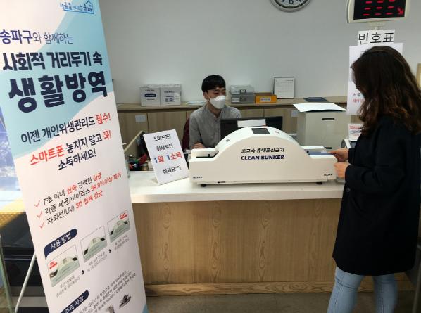 송파구(구청장 박성수)는 코로나바이러스감염증-19(코로나19) 예방하기 위해 서울시 자치구 최초로 잠실본동 주민센터(송파구 백제고분로15길 9)에 초고속 스마트폰 살균기를 지난 5월 28일부터 시범설치 운영했다고 1일 밝혔다.
