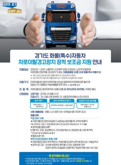 경기도가 신규제작·조립·수입된 총중량 20톤 초과 화물(특수)자동차를 대상으로 ‘2020년도 차로이탈경고장치 장착지원 사업’을 추진한다.