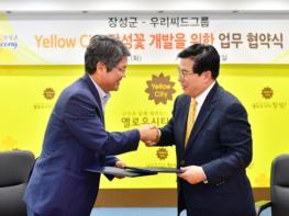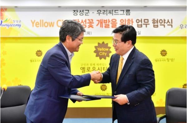 장성군은 26일 군청 2층 상황실에서 우리씨드그룹(이하 우리씨드)과 업무협약을 체결하고, 옐로우시티 장성을 대표할 수 있는 ‘옐로우플라워(가칭)’를 공동 연구?개발하기로 의견을 모았다. 우리씨드그룹은 전 세계 50여 국가에 꽃묘와 종자를 수출하고 있는 육종 전문 기업이다.