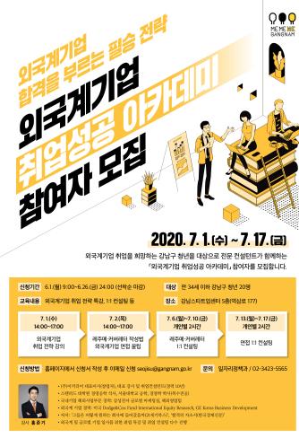 ‘기분 좋은 변화, 품격 있는 강남’을 구현 중인 강남구(구청장 정순균)가 취업난 극복을 위해 개최하는 ‘외국계 기업 취업성공 아카데미’에 참여할 미취업 청년 20명을 이달 26일까지 선착순으로 모집한다.