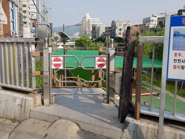 관악구(구청장 박준희)가 여름철 국지성 집중호우 시 도림천 수위 상승으로 인한 주민들의 고립사고 예방을 위해 진·출입로에 원격제어 차단기를 추가 설치하여 수해방지 대책을 강화한다고 밝혔다.