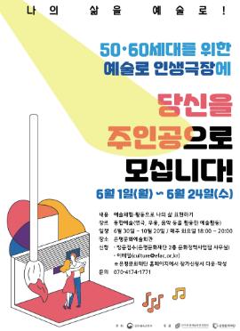 (재)은평문화재단(대표이사 홍미경)은 50,60세대가 문화예술활동을 누릴 수 있는 ‘예술로 인생극장’ 참가자를 6월 1일(월)부터 6월 24일(수)까지 모집한다고 밝혔다. 예술로 인생극장은 50?60세대가 예술로 삶을 돌아보고 새로운 인생을 탐색할 수 있도록 기획된 문화예술교육 프로그램이다.