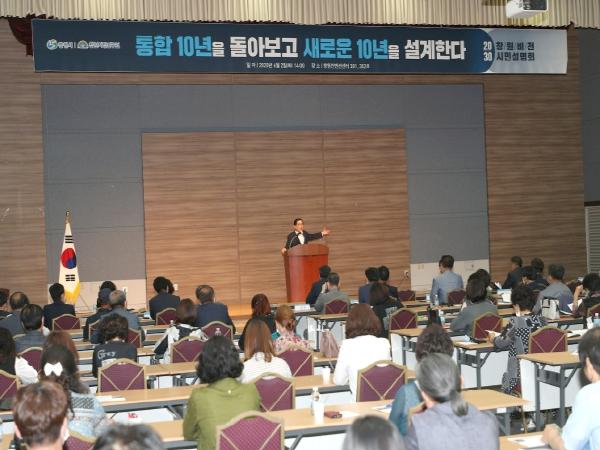 창원시(시장 허성무)는 2일 오후 2시 창원컨벤션센터에서 시민 등 150여 명이 참석한 가운데 ‘통합 10년을 돌아보고, 새로운 10년을 설계한다’는 주제로 권역별 설명회의 마지막인 ‘창원비전 2030 시민설명회’가 성황리에 마쳤다고 밝혔다.